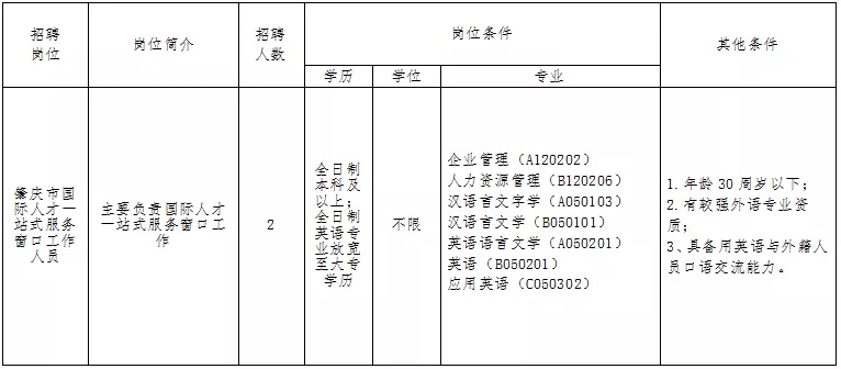 2、報(bào)名方式:請(qǐng)報(bào)考人員如實(shí)填寫《肇慶市國(guó)際人才一站式服務(wù)窗口招聘專職工作人員報(bào)名表》(附件),并上傳表格以及本人身份證、學(xué)歷學(xué)位證書、相關(guān)資格證書等復(fù)印件,電子郵箱:rczx512@126.com。