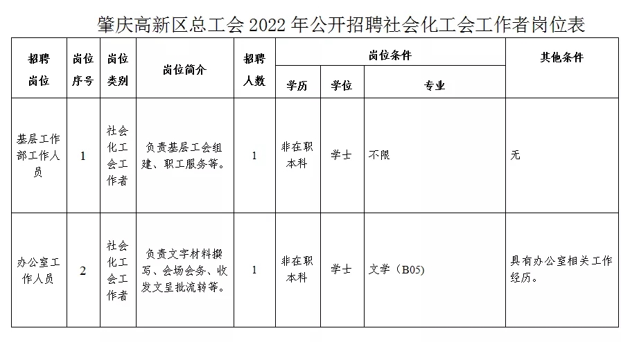 3、報(bào)名方法:采取現(xiàn)場(chǎng)報(bào)名形式進(jìn)行。報(bào)考人員須持《肇慶高新區(qū)總工會(huì)2022年公開(kāi)招聘社會(huì)化工會(huì)工作者崗位表》(附件2),并攜帶本人身份證、學(xué)歷學(xué)位證書(shū)、工作經(jīng)歷證明等原件及復(fù)印件,以及本人大一寸同底彩色免冠近照1張(用于貼報(bào)名表)到報(bào)名地點(diǎn)辦理報(bào)名手續(xù)(除《肇慶高新區(qū)總工會(huì)2022年公開(kāi)招聘社會(huì)化工會(huì)工作者崗位表》(附件2)外,其他證件、證明要求提供原件和復(fù)印件,驗(yàn)原件收復(fù)印件)。本次招聘考試無(wú)需繳納報(bào)名考務(wù)費(fèi)。聯(lián)系人:梁先生,聯(lián)系電話:0758-3641989/聯(lián)系人:曾先生,聯(lián)系電話:0758-3135356。